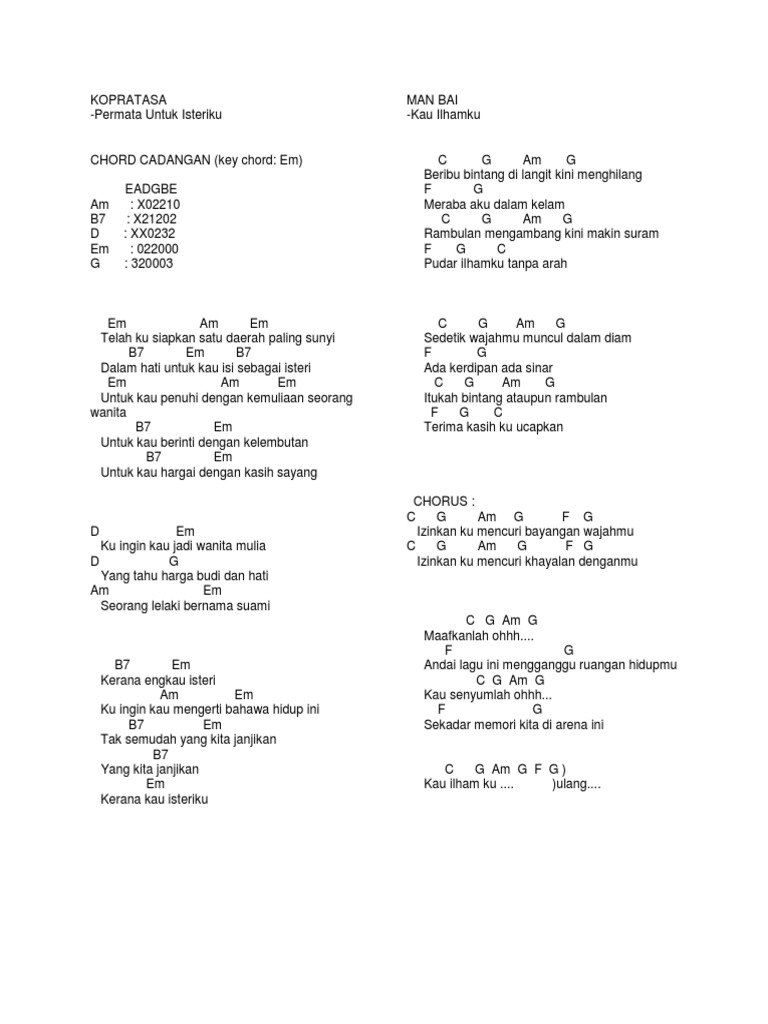 Man Bai - Kau Ilhamku Guitar TabJika anda ingin request boleh request di ruangan comments di bawah ya. Play along in a heartbeat. End on C Verse 1 C CB Beribu bintang di-langit Am G Kini menghilang F G Meraba aku dalam kelam C CB Rembulan mengambang Am G Kini makin suram F G C CB.